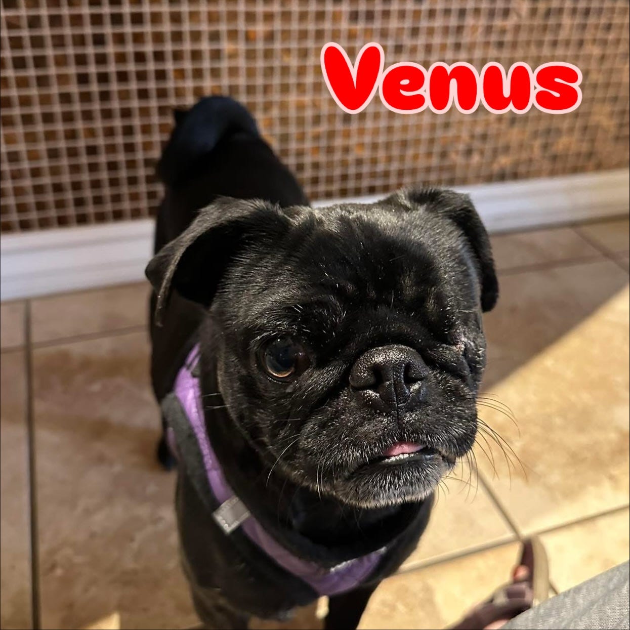 This gorgeous black pug has the brightest spirit and sweetest little wink! She may have just one eye, but she sees the world with more love than most. π